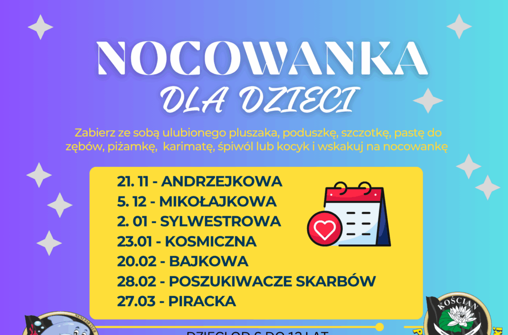 Zapraszamy wszystkie dzieci w wieku od 6 do 12 lat na wyjątkową noc pełną zabawy, śmiechu i niespodzianek !